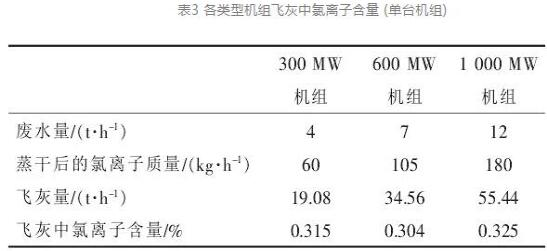 該工藝可將廢水蒸干物混入粉煤灰中。參照典型脫硫廢水水質(zhì)表,氯離子濃度按15000mg/L,飛灰含量按18g/m3計(jì),計(jì)算結(jié)果如表3所示(單臺機(jī)組)。