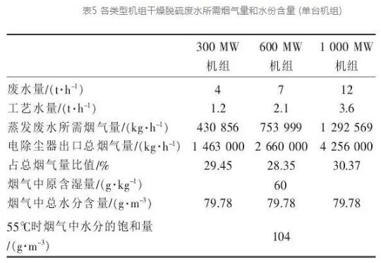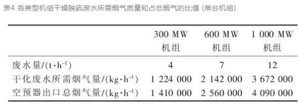 表4各類型機(jī)組干燥脫硫廢水所需煙氣質(zhì)量和占總煙氣的比值(單臺機(jī)組)