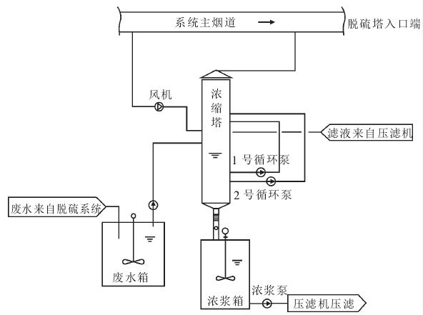 該工藝是利用部分電除塵器與脫硫塔之間的煙氣,將廢水在濃縮塔內(nèi)噴淋,與煙氣接觸后蒸發(fā),未蒸發(fā)的部分通過泵循環(huán)進(jìn)入濃縮塔加熱,脫硫廢水在煙氣的加熱下不斷濃縮,其中的溶解物逐步達(dá)到飽和并析出,析出的物質(zhì)通過板框壓濾機(jī)壓制成泥餅后外運(yùn)處理。工藝流程見圖2。