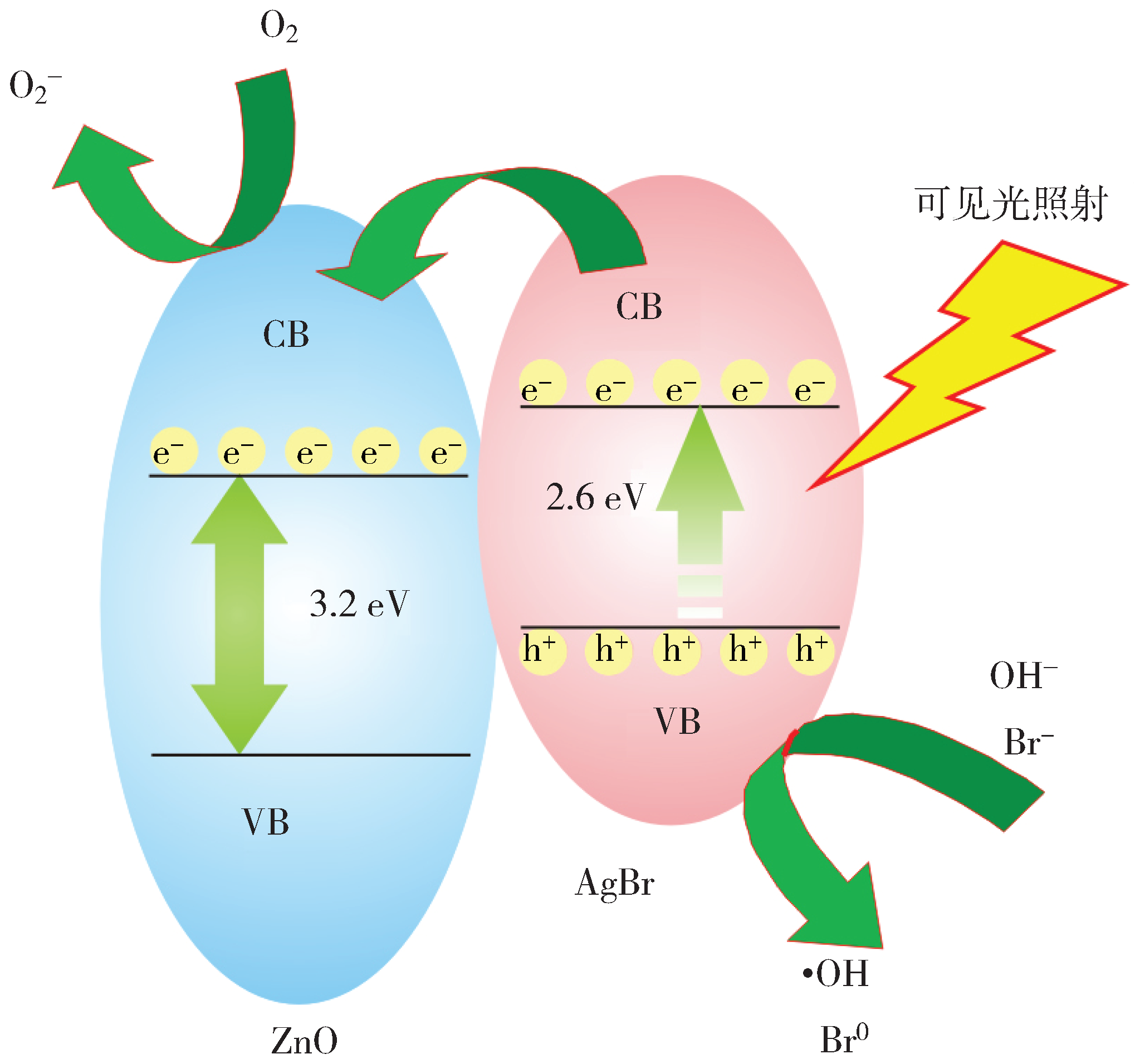 ZnO/AgBr復合光催化劑屬于半導體-半導體型復合材料。由圖8可知,ZnO的禁帶寬度為3.2 eV,其在紫外光區響應;而AgBr的禁帶寬度為 2.6 eV,其在可見光區具有響應[26-27]。當模擬可見光輻射,在羅丹明B溶液中加入ZnO/AgBr復合光催化劑,AgBr會被能量激發,產生電子-空穴對。由于 ZnO的能級低于AgBr的能級,所以AgBr導帶上聚集的光生電子會遷移并聚集在 ZnO的導帶上(conduction band, CB),使電子-空穴對實現有效分離。而吸附在ZnO/AgBr復合光催化劑表面的電子受體會誘捕 ZnO導帶上的光生電子,氧反應生成具有強還原性的•O2−負離子。AgBr的價帶(valence band, VB)中的光生空穴可以直接與羅丹明B反應,通過空穴與Br−和氫氧根離子的反應,產生羥基自由基和溴原子(Br0)。由于•OH 和 Br0具有強氧化性,可以將羅丹明B部分或完全氧化降解。半導體材料本身毒副性極小,性能優越,其光催化活性可應用于環境污染物的防護與治理。