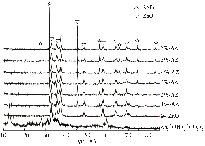 步驟1:在實驗過程中,首先需要配制0.02 mol·L−1 AgNO3 和0.02 mol·L−1 NaBr 溶液,再準備好6支干凈的試管分別標記1~6號,再依次加入0.1 g的ZnO粉末。步驟2:每支試管中先加入10 mL的已配制的AgNO3溶液,搖勻后進行離心。離心結束,倒去試管中上層清液,再在每支試管中加入10 mL的已配制的NaBr溶液,充分晃動15 min后,再離心,即完成第1次修飾,樣品編號為1%-AZ。重復步驟2,在2、3、4、5和6號試管中加10 mL AgNO3和10 mL NaBr溶液然后搖勻,依次完成2、3、4、5和6次的修飾,待所有修飾完成后,將樣品放入真空干燥箱中進行60 ℃、12 h干燥,樣品編號分別為2%-AZ、3%-AZ、4%-AZ、5%-AZ和6%-AZ,以備待用。