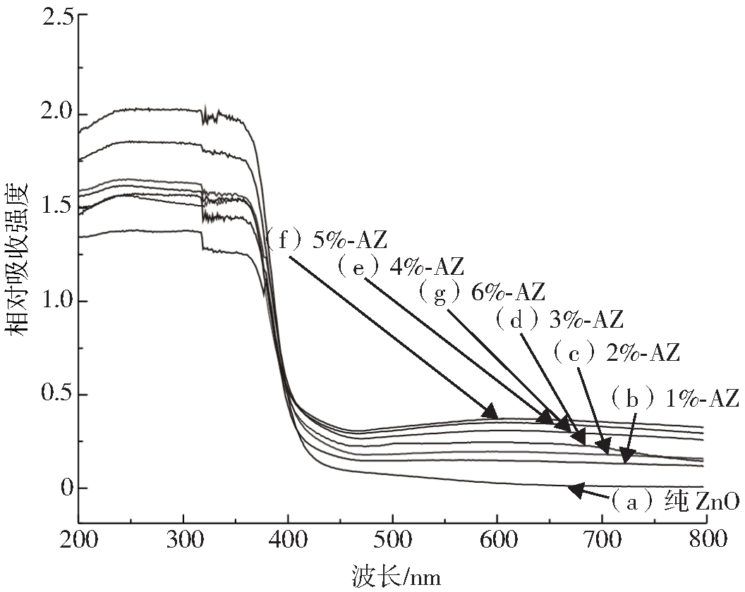 2)經過AgBr修飾的ZnO的形貌基本沒有發生變化,只是在其表面有AgBr顆粒出現。為探究修飾不同次數AgBr的ZnO/AgBr光催化劑的性能,在室溫可見光條件下,對其進行光催化檢測。結果表明,ZnO光催化性能明顯低于修飾不同量AgBr的ZnO/AgBr復合材料的光催化性能,其中5%-AZ的ZnO/AgBr復合材料光催化性能最為優異,而6%-AZ的ZnO/AgBr對可見光的吸收比5%-AZ的ZnO/AgBr有所下降,可能是由于AgBr對可見光有較強的吸收能力。隨著修飾次數的增加,在復合物中AgBr粒子含量增加,使得ZnO/AgBr對可見光的吸收能力增強,增加了其光催化能力。6%-AZ的ZnO/AgBr復合材料對可見光的吸收能力相比較5%-AZ的ZnO/AgBr復合材料有所下降,可能是由于納米AgBr粒子的團聚導致量子效應減弱,從而使ZnO/AgBr對可見光的吸收降低,降低了其光催化能力。