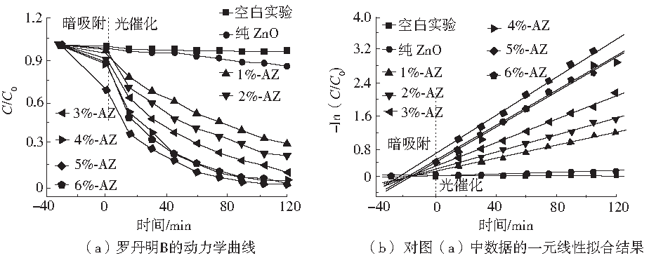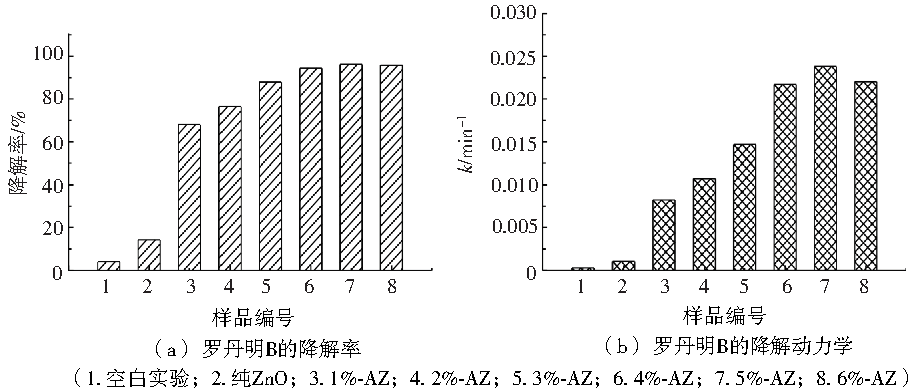 圖6(a)是當光催化降解時間達120 min時,樣品材料對羅丹明B降解情況。由圖6(a)可知,1%~5%的ZnO/AgBr復合材料對羅丹明B的光催化降解效率依次增加,5%-AZ的ZnO/AgBr復合材料對羅丹明B的光催化降解效率最高,為96.2%。6%-AZ復合材料的光催化降解的速率略有降低,但仍有95.7%。具體聯系污水寶或參見http://www.bnynw.com更多相關技術文檔。