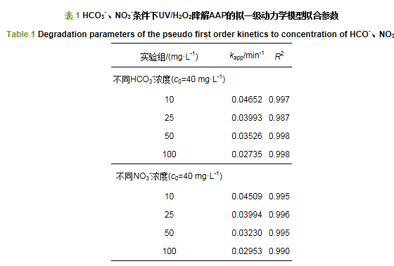 HCO3-作為一種羥基自由基的有效清除劑, 在通常情況下會與羥基自由基發生反應生成CO32-, 緊接著CO32-再與H2O2反應生成HO2·(李學艷等, 2013), 因此使得UV/H2O2工藝的反應速率常數降低.NO3-降低體系反應速率的原因主要在于一方面NO3-在紫外光的照射下就能產生·OH;另一方面由于NO3-對紫外光有較強的吸收, 從而起到惰性濾層作用, 阻止光線有效的穿過溶液(Du et al., 2007).而NO3-的吸收作用大于其產生·OH對AAP的氧化作用, 從而使得體系中產生·OH的效率下降, 因此抑制了UV/H2O2工藝對AAP的降解作用.