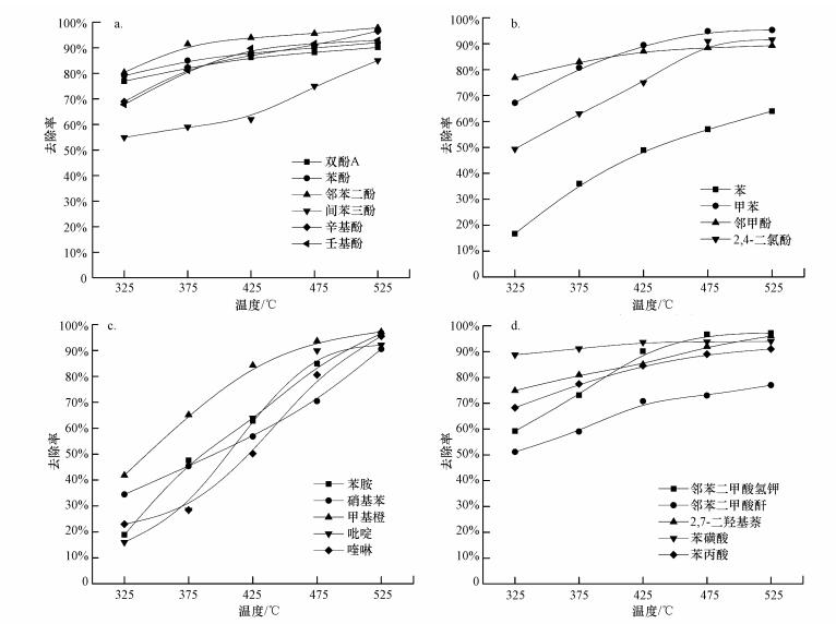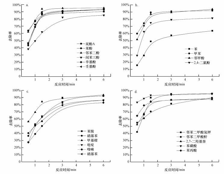 酚類化合物中, 鄰苯二酚、苯酚的最終去除率較高, 分別為98%、92%, 其次是間苯三酚的去除率為85%, 而苯的去除率最低為64%(圖 2a).可能是因?yàn)榻Y(jié)構(gòu)對(duì)去除率的影響較大, 苯的結(jié)構(gòu)為六角對(duì)稱, 最難降解, 間苯三酚為三角對(duì)稱, 比較難降解, 其余為非對(duì)稱結(jié)構(gòu), 易降解.林少琴等(2005)采用電催化氧化降解酚類廢水, 發(fā)現(xiàn)鄰苯二酚的降解率大于間苯三酚, 本研究結(jié)果與之一致.