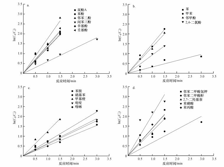 酚類化合物中, 鄰苯二酚、苯酚、雙酚A、辛基酚、壬基酚的降解動(dòng)力常數(shù)k′都大于0.02, 而含氮化合物苯胺、硝基苯、吡啶、喹啉的降解動(dòng)力學(xué)常數(shù)k′維持在0.01左右.可以看出, 含氮化合物比酚類化合物難降解, 可能是因?yàn)楹衔锝Y(jié)構(gòu)穩(wěn)定, 通過(guò)量子化學(xué)計(jì)算發(fā)現(xiàn)代表成鍵強(qiáng)度的BOn在兩類化合物中差別較大, 含氮化合物的BOn(0.920~0.964)遠(yuǎn)大于酚類化合物的BOn(0.828~0.879).謝成等(2007)采用Fenton氧化法處理焦化廢水, 發(fā)現(xiàn)酚類有機(jī)物在反應(yīng)10 min時(shí)的去除率為93.7%, 高于含氮有機(jī)物的89.2%, 本研究結(jié)果與之相似.