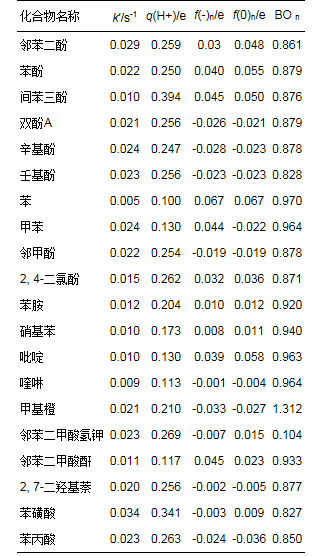 定量構(gòu)效關(guān)系(Quantitative Structure-Activity Relationships, QSAR)研究可以深入剖析化合物結(jié)構(gòu)與性質(zhì)的關(guān)系, 從而對(duì)化合物性質(zhì)和反應(yīng)機(jī)理進(jìn)行解釋和預(yù)測(cè), 是研究和預(yù)測(cè)化合物降解性的有效途徑.目前, QSAR的研究已廣泛應(yīng)用于藥物化學(xué)、環(huán)境毒理學(xué)及有機(jī)物降解動(dòng)力學(xué)等領(lǐng)域(Wang et al., 2004;Xiao et al., 2015;Qu et al., 2012).其中, 量子化學(xué)參數(shù)的選取是QSAR研究的重要環(huán)節(jié), 影響了預(yù)測(cè)的準(zhǔn)確性.眾多研究表明, 代表活性位點(diǎn)的Fukui指數(shù)、電荷密度、原子軌道電子布局?jǐn)?shù)等量子化學(xué)參數(shù)在討論化合物性質(zhì)時(shí)具有重要的意義(Wiktor et al., 2015;張世國(guó)等, 2004).