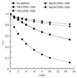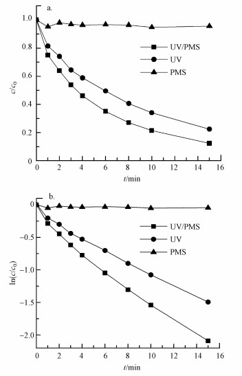 實驗比較了單獨UV、單獨PMS、UV/PMS 3種不同體系下RhB的降解效果,實驗中RhB的初始濃度為10 μmol·L-1,PMS初始濃度為50 μmol·L-1,溶液pH為7.19,結果如圖 2a所示.實驗結果表明,只添加PMS時,RhB溶液幾乎不降解,這是因為室溫下PMS自身穩定性較高,在未被外部因子活化的情況幾乎不產生活性自由基,對污染物的降解效果不顯著.在單獨UV照射下,反應15 min后RhB的去除率為77.6%.相對于單獨UV,體系中添加PMS后,RhB的降解速率和去除率都有所提高,在3 min左右時降解率即達到50%,反應15 min后,RhB的去除率約為90%,這是由于PMS在UV照射下可分解產生大量的強氧化性自由基SO4·-和·OH,從而加速了RhB的降解.采用準一級動力學對其進行擬合,得出不同反應體系下ln(c/c0)與反應時間的關系(圖 2b),可知RhB的降解遵循準一級動力學模型,且R2≥0.99.RhB在單獨PMS、單獨UV、UV/PMS體系中的準一級動力學速率常數(kobs)分別為0.001、0.092、0.135 min-1,UV/PMS體系表現出最佳的RhB去除效果.