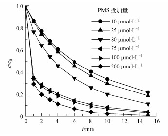 PMS投加量對RhB降解的影響如圖 4所示,結果表明,增大PMS的濃度可加快RhB的降解速度.當PMS的濃度從10 μmol·L-1增加到200 μmol·L-1時,反應15 min后,RhB的降解率從78.2%提高到99.3%.這是由于在UV/PMS體系中,隨著PMS初始濃度的增加,反應系統中活化形成的強氧化性自由基增多,進而使RhB的降解速率加快.在PMS濃度較低的情況下RhB降解符合準一級反應動力學.但當PMS的濃度增加到75 μmol·L-1后,RhB的降解表現出在反應的第1 min濃度驟降及隨后反應速率開始逐漸減緩的兩個階段.這是由于當體系中PMS濃度過大時,會發生如式(3)和(4)的反應,即溶液中過多的SO4·-還來不及與RhB反應,就與HSO5-發生反應或彼此之間相互發生淬滅反應,從而消耗高活性自由基,進而導致目標污染物的降解速率變緩甚至終止反應(Liang et al., 2009),因此,氧化劑的投加量要控制在合理范圍內.