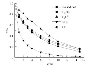印染工藝中會用到大量的添加劑、媒染劑,包含各種無機鹽,導致染料廢水成分非常復雜,對高級氧化過程有較大影響.本實驗研究了水體中常見陰離子對UV/PMS體系降解RhB的影響,當向反應體系中分別加入10 μmol·L-1的H2PO4-、C2O42-、NO3-和Cl-時,RhB的降解如圖 6所示.