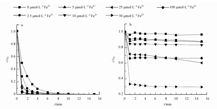 而Cl-、H2PO4-、C2O42-的加入則對反應起著不同程度的抑制作用,其抑制程度為Cl- 天然有機物(NOM)廣泛存在于水體中,其對高級氧化過程的影響不可忽略.不同NOM濃度下,RhB在UV/PMS體系中的去除如圖 7所示.由圖可見,在本研究濃度范圍內NOM的加入對RhB的降解有明顯的抑制作用.當體系中NOM濃度從1 mg·L-1增加到100 mg·L-1時,RhB的去除率由85.9%降低到10.0%,同時經計算,相應的準一級反應速率常數kobs由0.121 min-1迅速減小到0.0081 min-1.水體中的NOM對體系目標有機物的降解抑制作用主要有兩方面的原因:一是NOM通過吸收、屏蔽紫外輻射降低RhB的直接光降解;二是NOM可捕獲反應體系中的強氧化性自由基起到淬滅劑的作用,即其可與體系中的RhB進行自由基競爭,從而抑制了RhB溶液的降解(Liu et al., 2017).具體聯系污水寶或參見http://www.bnynw.com更多相關技術文檔 圖 7 圖 7 NOM濃度對UV/PMS體系降解RhB的影響([RhB]=10 μmol·L-1,[PMS]=50 μmol·L-1,pH=7.19) 3.6 Fe2+對UV/PMS去除RhB影響 過渡金屬可活化PMS產生強氧化性的SO4·-,從而使有機污染物得到降解.實驗考察了過渡金屬Fe2+存在時對UV/PMS體系降解RhB的影響.在UV/PMS體系下,RhB初始濃度為10 μmol·L-1,PMS初始濃度為50 μmol·L-1,初始pH為3時,Fe2+濃度對RhB降解的影響如圖 8a所示.同時,以相同條件下無UV輻射時、不同濃度Fe2+活化PMS降解RhB的反應作為對照實驗,結果如圖 8b所示.由圖可知,在僅添加PMS的體系中,RhB的降解呈現出在反應后的1 min內濃度迅速下降隨后反應趨于平緩甚至停止的兩個階段,這是由于反應開始時,Fe2+一接觸PMS即可迅速發生如式(9)所示的反應,產生大量SO4·-,使得PMS/Fe2+體系中RhB濃度急劇下降.但反應后生成的Fe3+被還原為Fe2+的速度非常緩慢,故隨后PMS被活化為活性自由基的速度變緩,使RhB的降解停滯.當Fe2+濃度從2.5 μmol·L-1增加到50 μmol·L-1時,反應15 min后,RhB去除率由12.2%提高到70.4%,但當Fe2+濃度進一步增加到100 μmol·L-1時,RhB的降解率反而迅速下降到33.6%,這是由于過量的Fe2+會與生成的SO4·-發生如式(10)所示反應,導致體系中活性自由基的耗損. 圖 8 圖 8 Fe2+濃度對RhB的降解影響(a.UV/PMS/ Fe2+體系,b.PMS/ Fe2+體系;[RhB]=10 μmol·L-1,[PMS]=50 μmol·L-1,pH=3) 實驗結果表明,在UV/PMS體系中,Fe2+的加入可顯著促進RhB的降解,且隨著Fe2+濃度的不斷增大,RhB的降解速率不斷加快,在反應10 min后,RhB的降解率幾乎達到了100%,但當Fe2+濃度超過25 μmol·L-1后,RhB的降解速率無顯著變化.UV/PMS/Fe2+體系中活性自由基通過紫外活化PMS及過渡金屬Fe2+活化PMS兩種方式產生,因此,與UV/PMS體系相比,RhB的降解速率有顯著提高.此外,在紫外輻射下,Fe2+由Fe3+還原再生的速度加快,同時還可以產生額外的·OH,這也是RhB在UV/PMS/Fe2+體系內降解加速的原因之一.但與PMS/Fe2+體系類似,過量的Fe2+也會造成UV/PMS/Fe2+體系中活性自由基的消耗,不利于RhB降解. 3.7 自由基的鑒定 為鑒定反應中起主要作用的活性自由基,向體系中加入2種常見的自由基清除劑甲醇(MeOH)和叔丁醇(TBA)進行淬滅研究.由于含有α-氫的醇(如MeOH)與SO4·-和·OH都具有較高的反應速率,可同時作為SO4·-和·OH的清除劑;而沒有α-氫的醇(如TBA)與·OH的反應速率比其與SO4·-的快約1000倍(Chen et al., 2012),故可選擇性清除·OH,因此,本研究選用MeOH和TBA作為自由基清除劑,用于鑒定體系中起主要作用的自由基.實驗選擇MeOH和TBA與PMS的物質的量比分別為3000:1、1000:1在體系中進行反應,結果如圖 9所示,15 min后,添加MeOH的兩組反應中RhB的最終降解率分別為18.2%、22.2%,添加TBA的兩組反應中RhB的最終降解率均為46.6%.可以看出,在中性條件下,MeOH、TBA對RhB的降解均具有明顯的抑制作用,且在相同條件下,MeOH對反應的抑制程度明顯強于TBA,說明反應體系中同時存在SO4·-和·OH兩種強氧化性自由基.但抑制作用隨MeOH和TBA濃度的增加變化不顯著,說明自由基清除劑與氧化劑物質的量比在1000:1時,即可達到幾乎完全淬滅相應活性自由基的效果.當TBA與PMS的物質的量比為1000:1時,體系中RhB仍有46.6%的去除率,但與未添TBA相比,RhB的降解率降低了43.9%,這種降低緣于TBA的投加淬滅了反應體系中的·OH,說明UV/MS體系中SO4·-和·OH兩種自由基對RhB的降解貢獻相當. 圖 9 圖 9自由基對UV/PMS體系降解RhB的影響([RhB]=10 μmol·L-1,[PMS]=50 μmol·L-1,pH=7.19) 3.8 RhB的降解機理 實驗考察了RhB在UV/PMS體系中降解過程的UV-Vis譜圖變化,結果如圖 10所示.RhB的降解主要通過2個競爭過程:一是N-位脫乙基作用,另一個是共軛結構(發色基團)的破壞.由圖可見,RhB在位于可見光區的554 nm處有主要吸收帶,另外在位于紫外光區的259 nm處也有特征吸收帶.RhB在554 nm的吸收主要源自于其共軛結構中的C=N和C=O結構,其在紫外光區的吸收主要來自RhB的苯環結構.實驗結果表明,隨著反應的進行,RhB在可見光區的最大吸收峰迅速降低,并且伴隨有藍移現象,溶液顏色從也紅色逐漸變為無色,說明發色基團逐漸被破壞并且有可能通過N-位脫乙基形成了一些中間產物;同時,其在259 nm處的吸收亦逐漸降低,說明降解過程中RhB的苯環結構受到破壞.因此,可以得出RhB在UV/PMS體系中的降解主要是通過共軛結構的破壞、N-位脫乙基并伴有苯環結構的破壞進行的. 圖 10 圖 10 UV/PMS系統中RhB降解過程的UV-Vis圖([RhB]=10 μmol·L-1,[PMS]=50 μmol·L-1,pH=7.19) 為進一步研究RhB在UV/PMS體系中的降解機理,實驗將RhB和PMS的初始濃度分別提高到200和1000 μmol·L-1,利用TOC和IC分別對RhB在降解過程中的礦化度和產物進