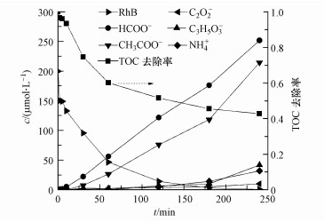RhB降解生成的離子及小分子有機酸的種類和濃度采用Dionex IC-1500離子色譜儀(IC)測定.陰離子測定使用Dionex公司生產的IonPac AS19陰離子色譜柱(4 mm×250 mm)及IonPac AG19陰離子保護柱(4 mm×50 mm),洗脫液為18 mmol·L-1的KOH溶液,流速1.0 mL·min-1.采用梯度淋洗法測定小分子有機酸,色譜柱及保護柱同上.具體方法為:先用1 mmol·L-1的KOH溶液淋洗5 min,再在28 min內將KOH溶液濃度從1 mmol·L-1逐漸增至35 mmol·L-1,最后用1 mmol·L-1的KOH溶液淋洗5 min.陽離子測定使用Dionex公司生產的IonPac CS12A陽離子色譜柱(4 mm×250 mm)及IonPac CG12A陽離子保護柱(4 mm×50 mm),洗脫液為20 mmol·L-1的甲基磺酸(MAS)溶液,流速1.0 mL·min-1.