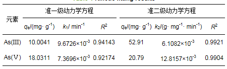 吸附動力學實驗中吸附劑的用量沿用前期實驗獲得的最佳結果(投加量為1 g· L-1, pH=6.5), 溶液體積為25 mL, 設置多個平行樣品, 同時放置于氣浴恒溫震蕩箱中, 按照時間序列先后間隔取出As(Ⅲ)、As(Ⅴ)樣品, 過濾離心后檢測溶液中砷的濃度并進行動力學擬合.