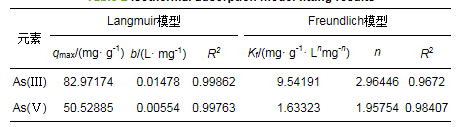 通過對兩種等溫吸附模型的R2可以判斷, MAMC對As(Ⅲ)、As(Ⅴ)的吸附過程更符合Langmuir模型, 推測MAMC是具有有限吸附位點的吸附劑, 對重金屬As進行單分子層吸附(Dada et al., 2012), 材料對As(Ⅲ)的理論最大吸附量(82.97174 mg· g-1)大于對As(Ⅴ)的理論最大吸附量(50.52885 mg· g-1), 說明材料對As(Ⅲ)的吸附能力優于As(Ⅴ)(Dixit et al., 2003; Yu et al., 2006).從Freundlich模型中發現, MAMC對As(Ⅲ)的不均勻系數均大于1且1/n介于0.1~0.5之間, 說明吸附過程為優惠吸附, 材料的吸附性能較好, 而MAMC對As(Ⅴ)的1/n大于0.5, 進一步強調了材料對As(Ⅲ)的吸附能力優于As(Ⅴ)這一結論.