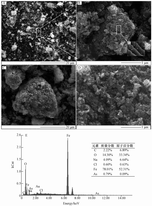冷場發射掃描電子顯微鏡的觀察結果如圖 2所示, 其中, 圖 2A、B為MAMC吸附As前的電鏡圖片, 圖 2C、D為MAMC吸附As后的電鏡圖片.從圖中可以看出, 材料表面有很多不規則的孔隙(圖 2B中陰影狀), 材料吸附前分散程度較高;此外, 可以較為明顯地觀察到圖 2B中材料表面負載了大量的顆粒狀的物體, 配套EDS能譜元素成分分析表明(圖 2E), 顆粒狀物體為鐵氧化物的可能性較大, 圖 2B中插圖a顯示出鐵氧化物顆粒密集地負載到了材料層間夾層孔隙中.綜上所述, SEM圖像能夠較為清晰地表明氧化鐵顆粒已經成功負載到了海藻酸鹽前驅體的表面;EDS數據表明, 材料鐵元素的占比高達52.32%以上, 且材料吸附前的As含量接近于0, 豐富的鐵氧化物為以砷酸根、亞砷酸根形式存在的砷離子提供了較為豐富的吸附位點.此外, 通過圖 2A、2B與圖 2C、2D的對比發現, 吸附后材料表面較為明顯的孔隙已經被大量絮狀物(圓桿狀)覆蓋, 材料的分散性降低, 并發生了較為明顯的團聚現象, 也進一步證實了吸附行為的發生.