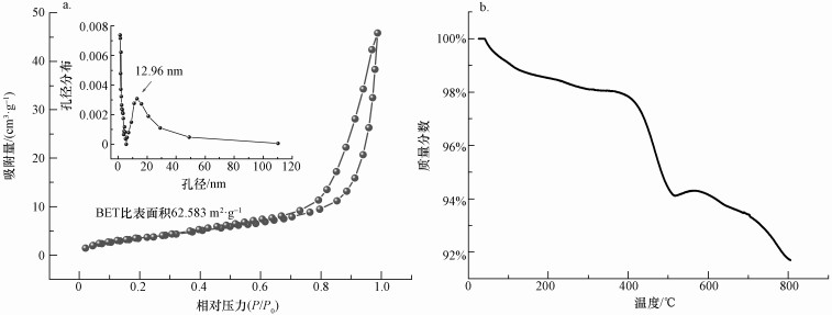 材料的BET和孔徑分析結果如圖 3a所示, MAMC的比表面積約為62.583 m2· g-1, 孔徑為12.96 nm, 證明材料屬于介孔材料范疇(孔徑介于2 ~50 nm之間).在氮氣環境下, 通過改變壓力并利用BJH法繪制了材料的吸附、脫附曲線, 可以明顯觀察到遲滯環在P/P0=0.63處出現(Liu et al., 2005).較高相對壓力區域MAMC沒有表現出任何吸附限制, 說明MAMC是一種吸附性能優越、空隙和比表面較為發達的介孔材料.熱重分析稱取樣品3.2 mg, 在氮氣環境下以10 ℃· min-1的升溫速度測試了材料的熱穩定性.從圖 3b中可以看出, 材料的總質量隨著溫度的升高逐漸降低, 熱解主要分為兩個階段:在0~300 ℃的溫度下熱解現象較為平緩, 熱穩定性較強;但溫度達到400 ℃以上時海藻酸鈉包埋前驅受熱分解揮發, 造成材料的熱解速率增加, 質量變化較為明顯(Tao et al., 2017).