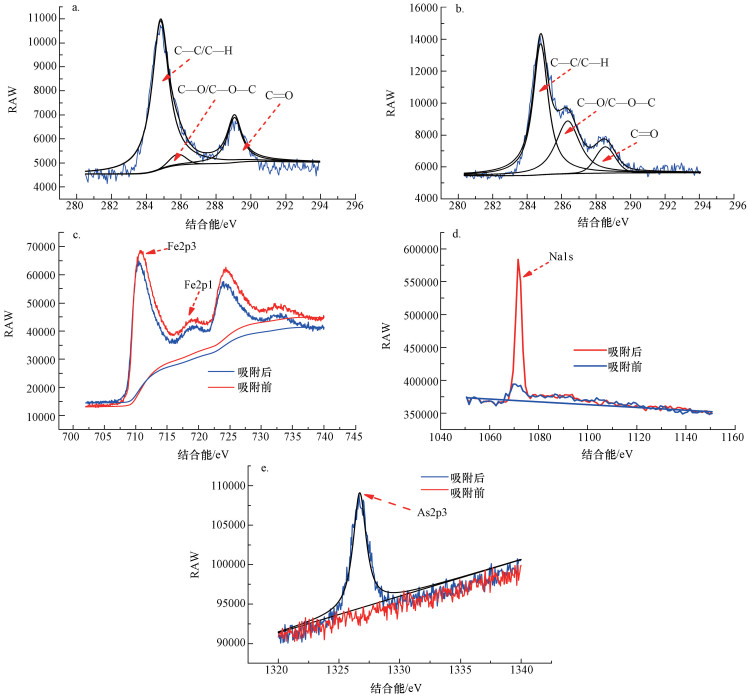 圖 4碳(a.吸附前, b.吸附后)、鐵(c)、鈉(d)、砷(e)元素核心軌道吸附前后的XPS圖像 Fig. 4 C1s(a.before, b.after), Fe2p(c), Na1s(d) and As2p(e) orbit before and after As adsorption