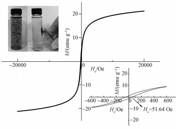 通過材料的磁性測試繪制了MAMC的磁滯回線, 在材料的吸附過程中施加磁場對溶液溶質進行磁分離(圖 5).材料的飽和磁化強度為20.86 emu· g-1, 矯頑力Hc=51.64 Oe, 吸附劑具有超強的順磁性(Mahdavinia et al., 2016), 能夠實現飽和吸附后介質之間的分離(磁場分離測試如圖 5左上角插圖所示), 磁滯回線的局部放大圖(右下角插圖)表明材料的磁滯后現象比較微弱, 理論上可以作為一種性能優越的永磁材料(矯頑力Hc>30 A· m-1)(Li et al., 2012).
