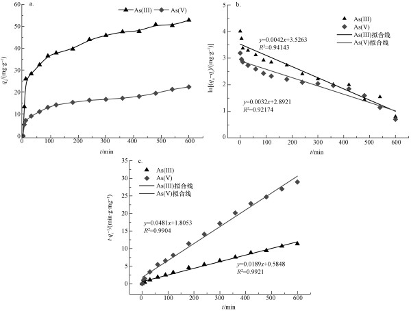 在同溫同壓下, As(Ⅲ)和As(Ⅴ)空白溶液濃度為150 mg· L-1, 利用吸附動力學實驗探究不同反應時間下材料對As(Ⅲ)、As(Ⅴ)的吸附量.實驗采用定時取樣法, 通過測定特定時間段平衡時的廢液濃度計算出特定時刻的吸附量, 用Origin9軟件對吸附過程進行線性準一級動力學(式(1))、準二級動力學(式(2))擬合(羅鈺等, 2017), 所得結果如圖 8所示.