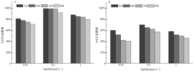 脫附再生實驗結果如圖 10所示, 實驗中分別采用0.01、0.1、1 mol· L-1的NaOH對吸附As(Ⅲ)和As(Ⅴ)的材料進行脫附和再生實驗.結果表明, 使用0.1 mol· L-1的NaOH作為材料的脫附和再生溶液較為理想(Babaee et al., 2017; Pitt et al., 2016), 材料在進行4次脫附后對As(Ⅲ)和As(Ⅴ)的去除效果仍然能夠保持在85%和59%左右, 材料對As(Ⅲ)、As(Ⅴ)的去除效果隨著脫附和再生次數的增加而減少.這可能是因為堿性環境會造成海藻酸鈉前驅和部分納米鐵氧化物的溶解, 從而造成部分吸附位點減少, 造成材料吸附容量的降低.