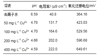 Cu2+污染加入陰極附近的上覆水中, 引起了電壓的迅速上升, 而且電壓增量與加入的Cu2+濃度具有顯著的線性關系.推測Cu2+能夠促進陰極反應.為了驗證這一推測, 檢測了CuSO4溶液的一系列化學性質(表 1).結果顯示, 隨著Cu2+濃度的增加, 溶液的電導率和氧化還原電位增加, 溶液pH降低.由于陰極進行以下反應(Wu et al., 2017):