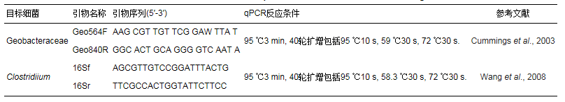 加銅3 h后采集所有處理及平行SMFCs裝置陽極附近土樣, 使用土壤DNA快速提取試劑盒(Fast DNA® SPIN Kit for Soil, MP)按照制造商說明書分別提取土壤DNA.地桿菌科(Geobacteraceae)和梭菌屬(Clostridium)細菌16S rRNA基因豐度采用實時熒光定量PCR法測定, 在CFX96 Real-Time System(BIO-RAD, Laboratories Inc, USA)儀器上運行檢測.這兩個類群細菌的qPCR反應體系都為20 μL, 包括10 μL 2×SYBR Premix Ex Taq (Takara, Japan), 20 μmol·L-1上下游引物各0.4 μL, 2 μL模板DNA及7.2 μL ddH2O.引物序列和反應程序見表 2.采用溶解曲線分析擴增產物的特異性, 反應程序為65~ 95 ℃, 每間隔0.5 ℃升溫測定熒光信號.采用10倍稀釋含有標靶基因的重組質粒制作標準曲線.地桿菌科(Geobacteraceae)和梭菌屬(Clostridium)細菌16S rRNA基因標準曲線模板的濃度分別為1.37×109~ 1.37×103 copies·μL-1和2.13×109~ 2.13×103 copies·μL-1.擴增效率分別為90.1%(R2 = 0.991)和102.1%(R2= 0.996).設置3個無模板樣品為陰性對照.