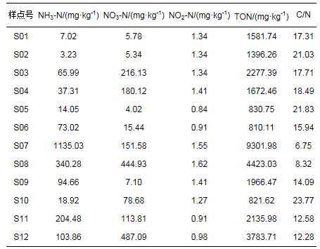 沉積物樣品無機氮(DIN)含量按照《土壤農化分析》(第三版), 經2 mol·L-1 KCl溶液浸提出氨氮(NH3-N)、硝氮(NO3--N)、亞硝氮(NO2--N)后, 按照上覆水測量方法測定(鮑士旦, 2000).總碳(TC)、總氮(TN)、硫(TS)及碳氮比(C/N)均采用Elementar公司Vairo EL Ⅲ型元素分析儀測定.沉積物中總氮為總有機氮(TON)與無機氮(DIN)之和.