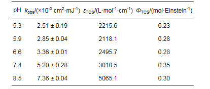 求出的ΦTCS見表 1.雖然TCS在pH 5.3時的摩爾吸光系數(shù)高于pH 5.9時的值,但是pH 5.3時的ΦTCS最小,因此,這兩種因素可能綜合影響了TCS在該pH值下的光解,使其在研究的pH值中降解速率最慢.TCS的pKa為8.1(Kliegman et al., 2013),隨著pH的升高,TCS主要以去質(zhì)子化的形態(tài)存在,由上述結(jié)果可知:去質(zhì)子化的TCS吸光能力強于質(zhì)子化的TCS.
