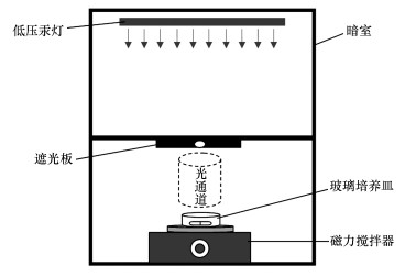 光照實驗在自制的平行光發(fā)射裝置中進行,如圖 1所示.所用光源為兩根15 W的低壓汞燈(Cole-Parmer公司),主要發(fā)射波長254 nm的紫外光.紫外光光強通過校準的光輻射計進行測定,平均光強為0.1 mW·cm-2.一個典型的試驗過程如下:在反應器(Pyrex玻璃培養(yǎng)皿)中加入總體積為10 mL的反應液,蓋上石英蓋,將反應器放置到磁力攪拌器上,打開遮光板,平行光即會照射到反應器中,反應即開始并開始計時,在指定的取樣時間點,取出0.15 mL的反應液加入到液相小瓶中,避光待測.整個試驗都是在恒溫和恒定攪拌速度下進行的.反應溶液的pH利用10 mmol·L-1的磷酸鹽緩沖液進行調(diào)節(jié).在TCS光解影響因素實驗中,使用初始濃度為1 μmol·L-1的TCS;在TCS光解產(chǎn)物研究中,TCS初始濃度為10 μmol·L-1.除了產(chǎn)物分析,其他所有實驗都至少重復3次.