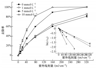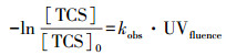式中,[TCS]0和[TCS]為反應前和指定的紫外線劑量下TCS的摩爾濃度(μmol·L-1);kobs為基于紫外線劑量的表觀準一級反應速率常數(shù)(cm2·mJ-1);UVfluence為紫外線劑量(mJ·cm-2).