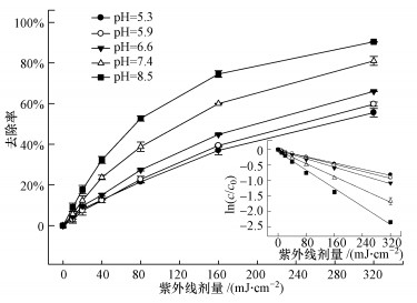 如圖 2所示,TCS在紫外輻射下可以發(fā)生降解,且降解效率隨著pH的升高而逐漸增大.TCS的光解符合準一級反應動力學,其降解速率可以表示如下: