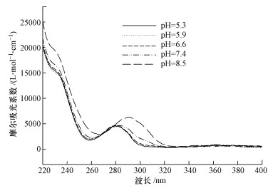 圖 3不同pH下TCS的摩爾吸光系數(shù) (實驗條件:[TCS]0 = 30 μmol·L-1, 10 mmol·L-1磷酸鹽緩沖液)