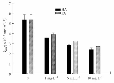 NOM在自然水體中是普遍存在的,在太陽光照下,其對水中污染物降解影響的研究已經(jīng)被大量報道(Canonica, 2007; Carlos et al., 2012; Yu et al., 2010).通常,NOM對水中污染物的去除具有雙重效應:①由NOM的遮光作用和自由基淬滅引起的抑制效應;②由激發(fā)態(tài)的NOM或光激發(fā)生成的活性氧物質(zhì)(Reactive Oxygen Species, ROS,如HO·、1O2和O2·-等)引起的促進作用(Carlos et al., 2012; Xu et al., 2011).當前研究中,我們分別采用腐殖酸(HA)和富里酸(FA)代表NOM,研究NOM對254 nm波長紫外輻射下TCS降解的影響.如圖 4所示,當存在不同濃度的HA或者FA時(通過溶解性有機碳來定量),TCS降解的表觀速率與純水中的相比會有一定程度的減小,且NOM濃度越高,TCS光解被抑制的越多.與FA相比,HA對TCS降解的抑制作用更大,這可能與它們的分子量及分子結(jié)構(gòu)不同有關,需要對此進一步研究.該結(jié)果表明:在直接紫外光解TCS時,NOM的效應①強于效應②.