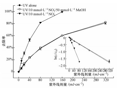 由圖 5可以看出,NO3-的存在可以促進TCS的光解,且降解速率隨著NO3-濃度的升高而增快.這可能歸因于光激發(fā)NO3-產(chǎn)生的HO·的作用.NO3-作為水中比較常見的一種光敏物質(zhì),其在太陽光照下可以產(chǎn)生HO·,如式(4)~(7)所示(Mack and Bolton, 1999).為了證明上述的解釋,我們向反應溶液中加入了HO·淬滅劑,即50 mmol·L-1甲醇(MeOH, kHO·/MeOH = 9.7 × 108 L·mol-1·s-1(Buxton et al., 1988)),結(jié)果如圖 6所示.相比于UV/NO3-體系,TCS在UV/NO3-/MeOH體系中的降解受到了一定的抑制,與其直接紫外光解類似.這一結(jié)果有力地證明了我們的推測.