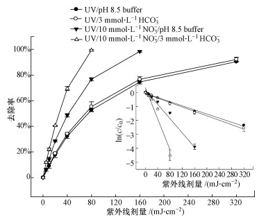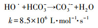 圖 7 UV/NO3-體系中HCO3-的影響 (實驗條件:[TCS]0 = 1 μmol·L-1, [NO3-]0 = 10 mmol·L-1, [HCO3-]0 = 3 mmol·L-1, 10 mmol·L-1磷酸鹽緩沖液(pH = 8.5))