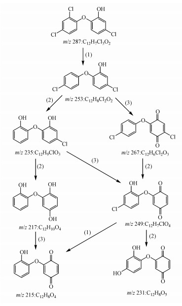基于檢出的降解產(chǎn)物,我們推測紫外光解TCS的反應機理主要包括3種不同的轉(zhuǎn)化路徑,分別為:(1)脫氯氫化、(2)脫氯羥基化、(3)醌化反應,如圖 9所示.TCS在吸收紫外光子后可以轉(zhuǎn)變?yōu)榧ぐl(fā)態(tài)的TCS,激發(fā)態(tài)的TCS可能會發(fā)生3種反應:①通過能量釋放(如發(fā)射熒光)轉(zhuǎn)變回基態(tài)的TCS;②直接分解;③通過能量轉(zhuǎn)移(Ⅰ類反應)或電子轉(zhuǎn)移(Ⅱ類反應)產(chǎn)生活性氧物質(zhì),如1O2、O2·-和HO·等,這些ROS可能與TCS發(fā)生反應.因此,TCS的紫外光降解可能包括直接光解和間接降解(自敏化降解)兩種反應途徑.其中,脫氯氫化可能是由直接紫外光解引起;脫氯羥基化和醌化反應可能是由自敏化降解引起.TCS通過脫氯氫化反應生成脫氯產(chǎn)物m/z 253,該產(chǎn)物通過脫氯羥基化反應和醌化反應分別生成產(chǎn)物m/z 235和m/z 267.生成的m/z 235通過路徑(2)和(3)分別產(chǎn)生產(chǎn)物m/z 217和m/z 249,氫醌產(chǎn)物m/z 217通過抽氫作用生成產(chǎn)物m/z 215.產(chǎn)物m/z 249除了由m/z 235通過醌化反應生成,還可以由m/z 267通過路徑(2)得到,該產(chǎn)物可進一步發(fā)生脫氯氫化和脫氯羥基化反應生成產(chǎn)物m/z 215和m/z 231.
