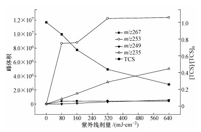 液相色譜——超高解析度四級桿飛行時間串聯(lián)質(zhì)譜儀(LC-QTOF/MS)用于TCS光解產(chǎn)物的檢測和分析.為了提高產(chǎn)物豐度以便于檢測,該部分研究使用初始濃度為10 μmol·L-1的TCS.為了避免磷酸鹽對儀器測定的干擾,實驗在超純水中進行.在紫外光解TCS反應中,共檢出7種降解產(chǎn)物,其分子質(zhì)量(Mw)、質(zhì)荷比(m/z)、分子式和可能的結(jié)構(gòu)見表 2.圖 8為TCS和主要反應產(chǎn)物(包括m/z 267、253、249和235)濃度隨時間的變化.由于缺乏反應產(chǎn)物的標準物質(zhì),故不能對其濃度進行定量,因此本研究直接采用各個產(chǎn)物的峰體積數(shù)值(從質(zhì)譜分析軟件MassHunter B.04.00直接獲得)來反映每種產(chǎn)物在反應體系中濃度的變化.從圖 8可以看出,TCS持續(xù)被降解,在紫外線劑量為640 mJ·cm-2時,大約75%的TCS被消除;四種主要產(chǎn)物的濃度不斷上升,其中m/z 253為最重要的產(chǎn)物.另外3種產(chǎn)物(m/z 231、217和215)在初始樣品中未被檢出,在光照后的水樣中至少被檢出2次,且濃度呈上升趨勢,因此,也被認為是TCS的光解產(chǎn)物.