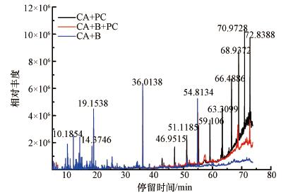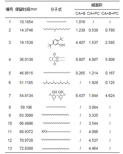通過(guò)GC-MS測(cè)定CA+B、CA+PC和CA+B+PC降解活性艷紅X-3B染料的產(chǎn)物.圖 8是氣相色譜的出峰圖,表 3是相應(yīng)停留時(shí)間對(duì)應(yīng)的物質(zhì).結(jié)合圖 8和表 3可發(fā)現(xiàn),反應(yīng)體系結(jié)束后,CA+B降解染料的中間產(chǎn)物主要是具有苯環(huán)結(jié)構(gòu)的芳香烴物質(zhì),以及少量的短鏈烷烴物質(zhì).而CA+PC體系中累積的中間產(chǎn)物主要為高分子量的長(zhǎng)鏈烷烴物質(zhì),芳香烴類的有機(jī)物相對(duì)較少.此外,在CA+B+PC反應(yīng)體系中,相比于CA+B,芳香烴類化合物含量減少,而對(duì)比于CA+PC,該反應(yīng)溶液中的長(zhǎng)鏈烷烴類物質(zhì)類型和含量都有所降低.基于以上試驗(yàn)結(jié)果,可以推測(cè)CA+B+PC中光催化與微生物的相互作用關(guān)系如下:最初,由于反應(yīng)溶液中含有大量的DO,在模擬太陽(yáng)光的照射下(鹵素?zé)簦ㄩL(zhǎng)),光催化活性強(qiáng),活性艷紅X-3B染料的發(fā)色基團(tuán)在光催化與微生物的共同作用下被破壞,使其溶液脫色,此時(shí)光催化的脫色速率遠(yuǎn)遠(yuǎn)大于微生物脫色速率.然后,光催化劑產(chǎn)生的自由基繼續(xù)攻擊染料分子中的苯環(huán)結(jié)構(gòu),開(kāi)環(huán)及一系列的加成聚合等反應(yīng)生成長(zhǎng)鏈烷烴化合物.隨著時(shí)間延長(zhǎng),DO量減少,光催化活性也隨之降低,長(zhǎng)鏈烷烴類物質(zhì)就很難繼續(xù)被降解.此時(shí)由于光合細(xì)菌的存在,長(zhǎng)鏈烷烴化合物易被微生物降解.總的來(lái)說(shuō),光催化劑的存在可以降低芳香烴物質(zhì)的累積量從而減少該化合物對(duì)微生物的影響,而體系中光合細(xì)菌又可以彌補(bǔ)光催化的缺點(diǎn).這就是復(fù)合材料降解模擬印染廢水中芳香烴與烷烴化合物濃度相對(duì)較低,COD和染料去除率高的原因.