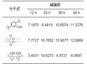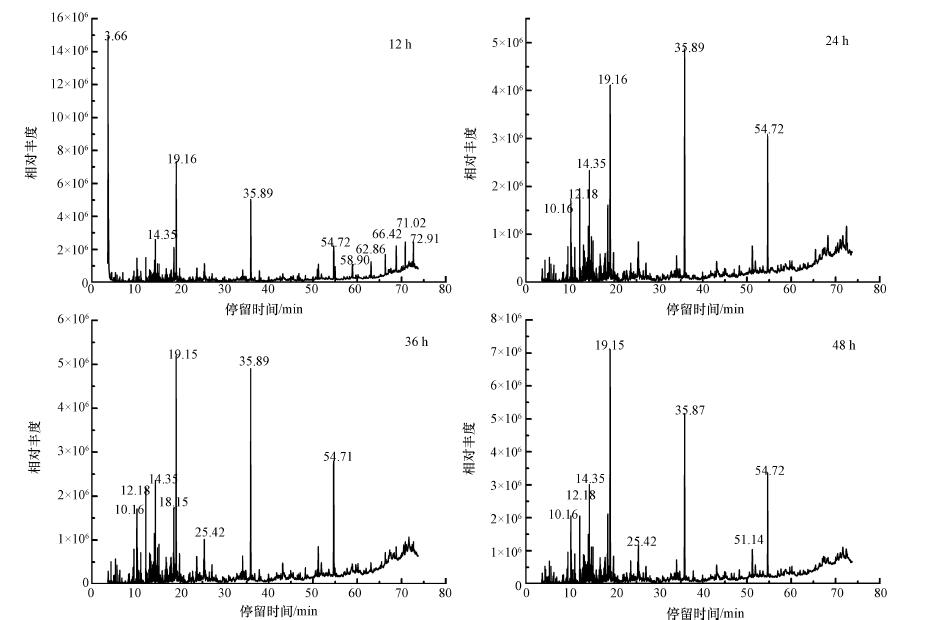 為了更進(jìn)一步了解CA+B+PC降解染料的途徑,試驗(yàn)每隔12 h取樣,測(cè)定其COD(表 4),并利用GC-MS對(duì)中間產(chǎn)物進(jìn)行檢測(cè)分析(圖 9).反應(yīng)12 h的氣相出峰圖中,停留時(shí)間為58.90、62.86、66.42、71.02、72.91 min時(shí)的物質(zhì)都為長(zhǎng)鏈烷烴類化合物,而隨著反應(yīng)時(shí)間的延長(zhǎng),長(zhǎng)鏈烷烴物質(zhì)逐漸減少,36和48 h時(shí)幾乎不存在這些物質(zhì).圖 9中停留時(shí)間約為19.15、35.89和54.72 min左右的物質(zhì)分別為2, 4-二叔丁基苯酚、鄰苯二甲酸二丁酯、2, 2′-亞甲基雙-(4-甲基-6-叔丁基苯酚),這些具有芳香烴結(jié)構(gòu)的化合物峰面積變化規(guī)律如表 5所示.根據(jù)試驗(yàn)結(jié)果可以推測(cè),反應(yīng)前12 h,光催化降解染料速率遠(yuǎn)遠(yuǎn)大于光合細(xì)菌的降解速率,光催化起主導(dǎo)作用,此時(shí)溶液在脫色的同時(shí),一些自由基會(huì)破壞染料分子中的苯環(huán)結(jié)構(gòu),使其生成長(zhǎng)鏈烷烴類化合物.12 h后,由于光合細(xì)菌已經(jīng)開(kāi)始適應(yīng)體系中的新環(huán)境,光合細(xì)菌降解染料生成苯環(huán)結(jié)構(gòu)化合物的同時(shí),可以即時(shí)迅速地將光催化氧化生成的長(zhǎng)鏈烷烴降解礦化.這也是CA+B+PC降解染料中后期一直沒(méi)有長(zhǎng)鏈烷烴化合物出現(xiàn)的原因.在12~24 h期間,可以發(fā)現(xiàn)芳香烴化合物迅速增加,24 h后減少,可能是因?yàn)榇藭r(shí)光合細(xì)菌作用大于光催化作用,酚類、酯類化合物生成量大于其降解量,使其累積,而后緩緩降解.