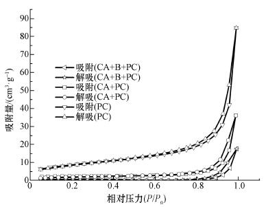 圖 3 PC、CA+PC、CA+B+PC的N2吸附-脫附等溫線