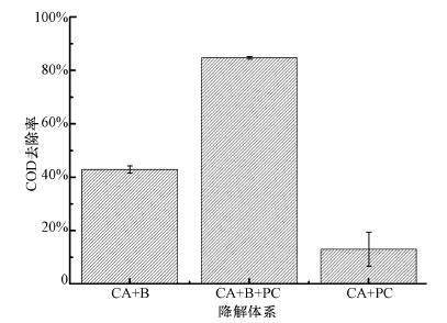 繼續(xù)進(jìn)行高COD的模擬印染廢水的降解試驗(yàn),收集反應(yīng)96 h后剩余COD的數(shù)據(jù)并計(jì)算相應(yīng)COD的去除率(圖 5).由圖 5可見(jiàn),CA+B、CA+PC和CA+B+PC的COD去除率分別為13.0%、42.9%、84.7%.CA+PC與CA+B+PC對(duì)COD去除率的不同在于光合細(xì)菌的作用.光催化劑產(chǎn)生的自由基由于受到模擬廢水中加入的NaHCO3、NH4Cl等的影響及氧氣的限制,并不能完全礦化反應(yīng)體系中的有機(jī)物,累積中間產(chǎn)物使得COD去除率較低(Konstantinou et al., 2004;Guillard et al., 2003).相反地,在光催化結(jié)合微生物反應(yīng)體系中,染料隨光催化降解產(chǎn)生的中間產(chǎn)物和可生化降解的葡萄糖一起進(jìn)入復(fù)合材料內(nèi)部,迅速被光合細(xì)菌降解、礦化.