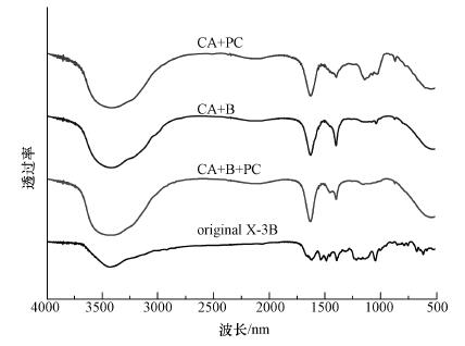 在活性艷紅X-3B的FT-IR光譜中(圖 7),3435 cm-1處的峰為N—H和O—H的伸縮振動(dòng)吸收峰,1539、1490和1454 cm-1處的峰為苯環(huán)、萘環(huán)或三嗪環(huán)的骨架振動(dòng)吸收峰,1220、1172、1140和1051 cm-1處的峰為染料分子結(jié)構(gòu)中R-SO3-的吸收峰,1629 cm-1對(duì)應(yīng)的峰為N=N的吸收峰(Kaewsuk et al., 2010).由圖可見(jiàn),3種材料的降解產(chǎn)物中都含有O—H和N—H的吸收峰,1634 cm-1處的強(qiáng)吸收峰為C=O的伸縮振動(dòng)峰.結(jié)合表 2可知,3種材料降解反應(yīng)結(jié)束后,pH值都有所下降,其中pHCA+PC>pHCA+B+PC>pHCA+B,說(shuō)明反應(yīng)體系中都有羧酸產(chǎn)生.羧酸的可能來(lái)源是葡萄糖的生物降解及光催化降解活性艷紅X-3B所產(chǎn)生.在1450~1540 cm-1處仍存在吸收峰,這可能為苯環(huán)、萘環(huán)或三嗪環(huán)的骨架振動(dòng)吸收峰,表明活性艷紅X-3B染料分子沒(méi)有被100%的降解即完全礦化,苯類物質(zhì)很難進(jìn)一步被分解.由圖 7還可發(fā)現(xiàn),CA+B反應(yīng)產(chǎn)物中苯環(huán)的吸收峰(1450~1540 cm-1)比CA+PC與CA+B+PC反應(yīng)產(chǎn)物的苯環(huán)吸收峰更強(qiáng)烈,說(shuō)明光合細(xì)菌對(duì)苯環(huán)類物質(zhì)降解能力較差,這與紫外-可見(jiàn)全波長(zhǎng)掃描譜圖分析的結(jié)論一致.CA+B+PC的FT-IR光譜中沒(méi)有1220、1172、1140和1051 cm-1的吸收峰,說(shuō)明R-SO3-的吸收峰消失,表明—SO3Na基團(tuán)被破壞降解.