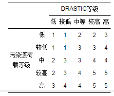 矩陣法也是常用的地下水污染風(fēng)險評價的方法, 其特點(diǎn)是簡明扼要、易于直觀表達(dá)(Zhang et al., 2016).矩陣法主要考慮了不同的水文地質(zhì)條件及能承受的污染源荷載等級, 具有相同污染等級的地區(qū)可能具有不同的風(fēng)險等級(Ducci et al., 2008), 具體如表 1所示, 值1、2、3、4和5分別代表低、較低、中等、較高、高的地下水污染風(fēng)險值.例如, 污染源荷載等級為高, DRASTIC等級為中等時, 污染負(fù)荷等級為較高.