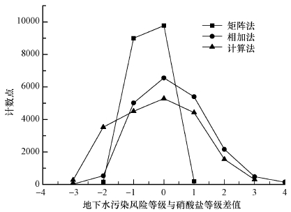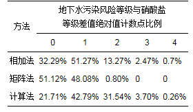 將3種方法得到的地下水污染風(fēng)險等級結(jié)果與硝酸鹽濃度分布等級結(jié)果進(jìn)行對比, 得到地下水污染風(fēng)險等級與硝酸鹽等級差值計數(shù)(圖 8), 表 2為3種方法得到的等級差值所占比例.由圖 8及表 2可知, 矩陣法與相加法得到的地下水污染風(fēng)險等級與硝酸鹽等級差值主要等級差的計數(shù)點(diǎn)均在0處取到最大, 等級差值為1次之;而計算法得到的等級差絕對值在1處取到最大.根據(jù)表 2可知, 矩陣法得到的99.2%計數(shù)點(diǎn)的污染風(fēng)險等級與硝酸鹽等級差分布在0和1.反觀相加法和計算法, 其等級差值較大, 這主要是由于相加法與計算法均在某些地區(qū)突出了脆弱性等級和污染源荷載等級的極端情況.由此可知, 對于研究區(qū)來說, 矩陣法明顯優(yōu)于另兩種方法, 得到的結(jié)果更符合實際.