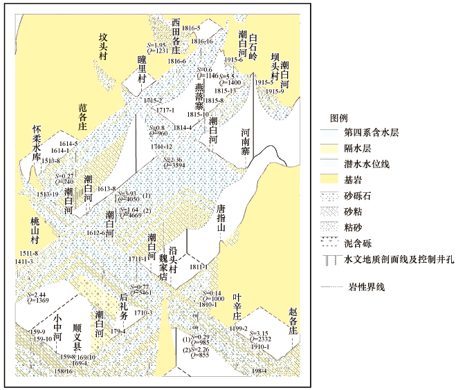 根據(jù)收集的研究區(qū)內(nèi)地質(zhì)鉆孔資料, 對研究區(qū)的水文地質(zhì)條件進(jìn)行分析, 建立了水文地質(zhì)概化結(jié)構(gòu)圖(圖 2).研究區(qū)含水層主要由砂、礫石、卵石組成, 從北向南介質(zhì)粒徑由粗變細(xì), 含水層由單一層過渡到多層, 巖層厚度由薄變厚.區(qū)域內(nèi)含水層結(jié)構(gòu)東西方向差異較大, 東部為潮白河主河道滾動區(qū), 含水層厚, 層次少、粒徑大、孔隙大;西部為懷河、雁棲河、小中河滾動區(qū), 含水層薄, 層次多、粒徑較小、透水性相對較差.
