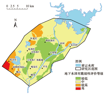 將各指標(biāo)圖層在ArcGIS軟件中完成矢量化、數(shù)值化, 并依據(jù)權(quán)重進(jìn)行疊加計算.將各評價指標(biāo)的分類等級圖根據(jù)疊加公式進(jìn)行疊加分析, 結(jié)果重新劃分為4個等級, 得到研究區(qū)地下水脆弱性等級分區(qū), 結(jié)果如圖 3所示.整個研究區(qū)有25.72%的地下水脆弱性等級為較低, 大部分位于研究區(qū)中部, 其中, 沙河、十里堡、西田各莊、王化水處理廠、梭草位于該區(qū)域, 地下水的防污性能最好.這是由于該區(qū)域地下水埋深較大, 土壤介質(zhì)、包氣帶介質(zhì)、含水層介質(zhì)類型抗污性良好.整個研究區(qū)有61.79%的地下水脆弱性等級為中等, 其中, 范各莊、東白巖、平頭位于該區(qū)域.整個研究區(qū)有10.94%的地下水脆弱性等級為較高, 位于研究區(qū)西南部、西北部小部分區(qū)域, 其中, 懷北莊、前辛莊、前橋梓村東、桃山位于該區(qū)域.相對而言, 整個研究區(qū)僅有1.56%的地下水脆弱性等級為高, 位于研究區(qū)西南部小部分區(qū)域的地下水脆弱性等級為最高, 防污性能最差.這是由于該區(qū)域地下水埋深較小, 埋深最小位置在1.5 m以下, 土壤介質(zhì)為粉礫質(zhì)亞粘土、包氣帶介質(zhì)為風(fēng)化巖或塊狀灰?guī)r, 含水層介質(zhì)類型較其他區(qū)域容易污染.