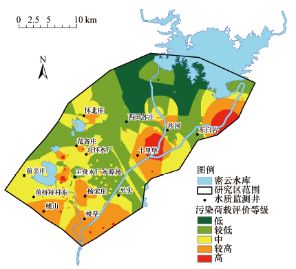 根據(jù)調(diào)查結(jié)果, 研究區(qū)地下水負(fù)荷風(fēng)險的主要來源是家禽養(yǎng)殖場、加油站、垃圾填埋場、工業(yè)污染源和污水處理廠.將各種類污染源圖層在ArcGIS軟件中完成矢量化、數(shù)值化后進(jìn)行疊加計算, 結(jié)果重新劃分為5個等級, 得到研究區(qū)污染荷載評價等級, 結(jié)果如圖 4所示.由圖 4可知, 污染載荷強(qiáng)的地區(qū)主要分布在研究區(qū)東部、東北部及西部零星地區(qū), 主要原因是受排污口的影響較大;污染載荷較強(qiáng)的地區(qū)主要分布在污染載荷強(qiáng)的地區(qū)周圍;污染載荷較弱、弱的地區(qū)主要分布在研究區(qū)的北部, 主要原因是該地區(qū)無工業(yè)污染源及排污口, 污染源較少.
