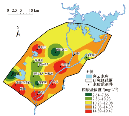 在同一地區(qū)對同一個數(shù)據(jù)使用不同的方法進(jìn)行分析, 所得到的地圖結(jié)果也會有所不同, 有時甚至?xí)嗷ッ?北京市地下水開采量占全市供水量的2/3左右, 是國際上為數(shù)不多的以地下水作為供水水源的大都市之一(郇環(huán)等, 2011).北京密懷順(密云-懷柔-順義)地區(qū)包括懷柔應(yīng)急水源地和水源八廠水源地, 主要為北京城區(qū)提供地下水資源, 開展更準(zhǔn)確的地下水污染風(fēng)險評價可為合理開發(fā)利用地下水資源和改善水質(zhì)提供科學(xué)依據(jù).故本文以北京密懷順地區(qū)作為示例, 選取3種最常用的地下水污染風(fēng)險評價方法(相加法、矩陣法和計算法), 通過硝酸鹽濃度分布進(jìn)行對比驗證, 旨在為研究區(qū)選取最優(yōu)的地下水污染風(fēng)險評價方法, 以便幫助決策者和管理者制定地下水保護(hù)的管理措施.