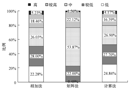 圖 6相加法、矩陣法和計算法地下水污染風(fēng)險分區(qū)比例