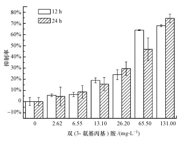 不同濃度雙(3-氨基丙基)胺對混合菌群微生物附著特性的影響結果如圖 1所示.微生物經2.62~131 mg·L-1雙(3-氨基丙基)胺處理12 h附著量下降了5.61%~67.93%, 處理24 h附著量下降了4.60%~74.61%.可見在選定的兩個時間段對微生物附著的抑制作用均隨著雙(3-氨基丙基)胺濃度升高而增強.